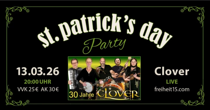 Mit irischem Bier, feinem Whisky und mitreißender Livemusik feiern wir den irischen Feiertag. Lassen Sie den Alltag hinter sich und tanken Sie eine ordentliche Portion irischer Lebensfreude. Für die passende Atmosphäre sorgt die Band CLOVER – langjährige Stammmusiker unseres Hauses und leidenschaftliche Vertreter des irischen Folk. Mit ihrer Musik werden sie den Saal garantiert zum Kochen bringen.